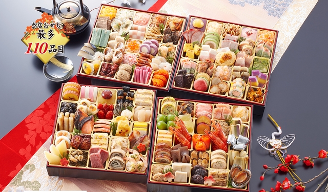 和洋おせち四段重「百彩」は、100品目を優に超える、花びしホテル最多110品目を盛り込んだインパクト抜群の豪華なおせち。